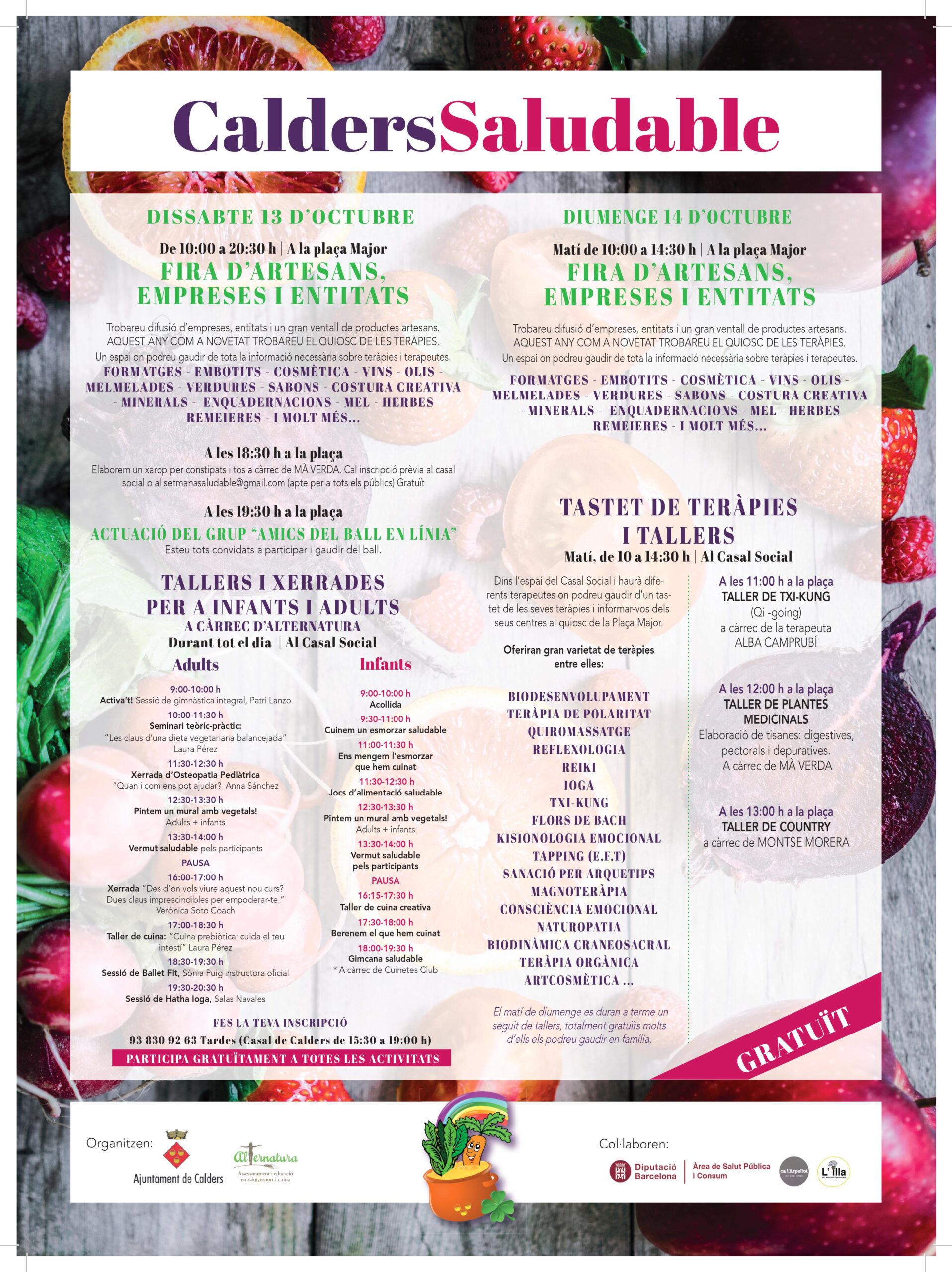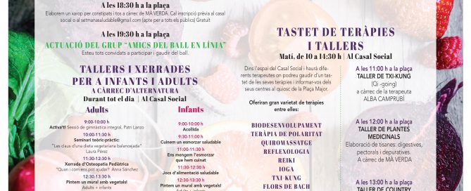 MUESTRA DE TERAPIAS De 10:00 a 14:30 h en el Casal Social Dentro del espacio del Casal Social y habrá diferentes terapeutas donde podrá disfrutar de una degustación de sus terapias e informarle de sus centros en el quiosco de la Plaza Mayor. Ofrecerán gran variedad de terapias entre ellas: BIODESARROLLO TERAPIA DE POLARIDAD QUIROMASAJE REFLEXOLOGÍA REIKI YOGA CHI KUNG [...]